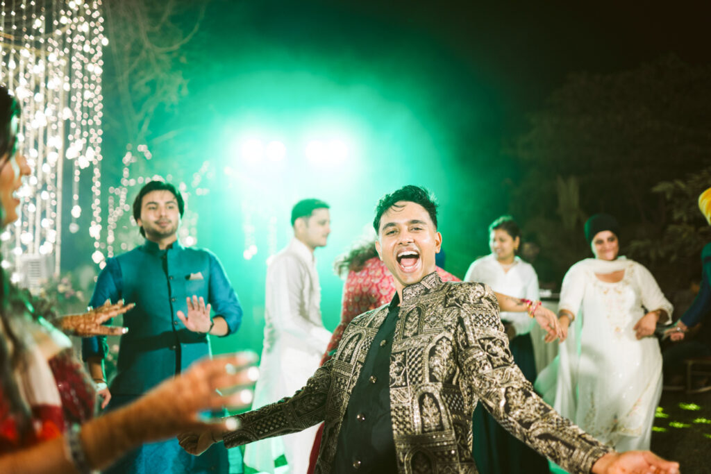 • Sangeet was pure electricity — friends on stage, parents joining in, and the night ending in full-blown dance chaos.